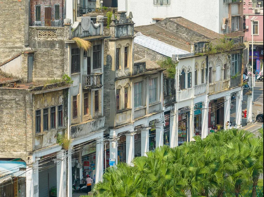 浐湾路沿街骑楼,位于会城冈州大道中原浐湾路段北侧。古书中“浐浐”指鱼群流水的样子。浐湾街,位于象山西南侧脚下,古时为大海,随着泥沙不断淤积,形成浅湾,常有鱼群游动。后这一带经过加高,陆续建起民房,人流开始聚集,形成了浐湾街。由于该地位于古城池西南外的交通要道,且临会城河水运便利,后逐步发展为繁华的集市,成为会城重要的物流集散地。
