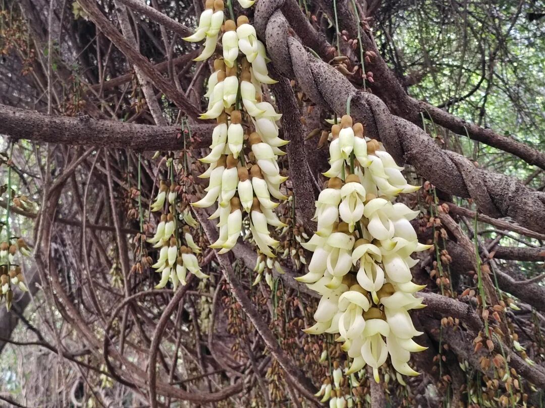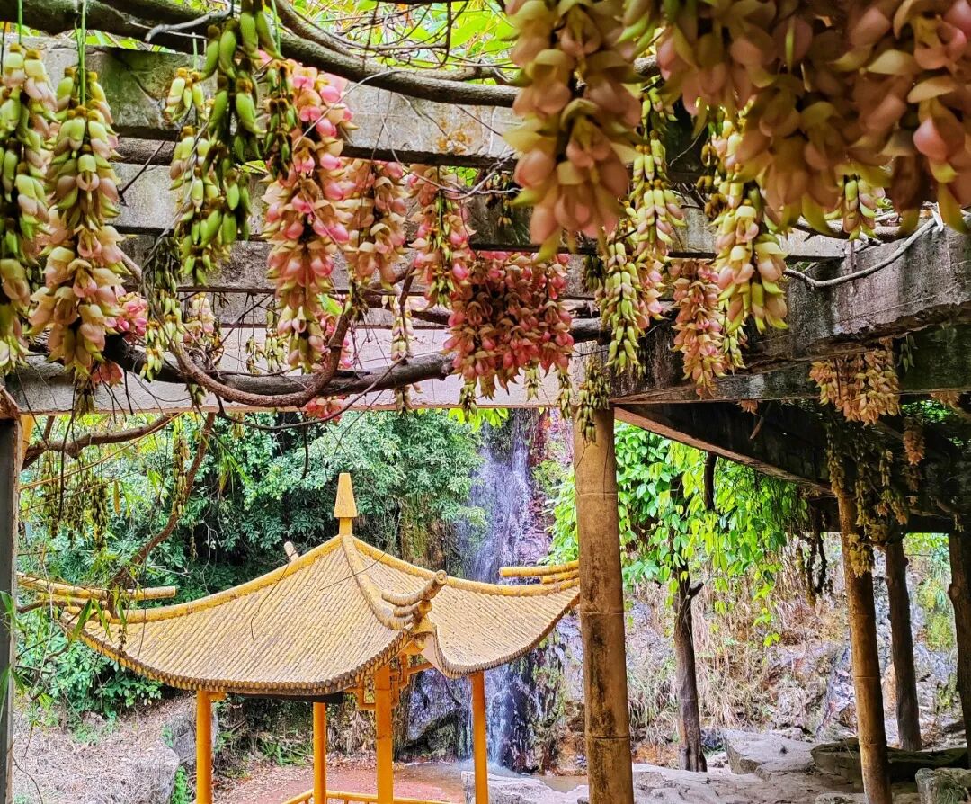粉红禾雀花,学名美叶油麻藤,是大雁山特有的野生品种。这棵禾雀花藤龄己有50多年,从清沽潭边一处岩缝开始蔓延,藤茎苍虬犹若巨蟒,游走攀爬于山石树林之间,生长覆盖面积已有50多亩。它的花形奇特,神似一只娇小可爱的禾雀,头、嘴、翼、尾一应倶全,惟妙惟肖,神形兼备。花色白里透红,犹如少女初妆、娇艳欲滴。