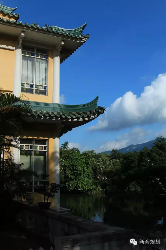 迎宾馆前身为圭峰招待所,枕湖面山,绿树成荫,亭台楼阁,曲廊回转,侧旁小桥流水,采撷周边的盘趣园、马山公园之景,融汇邻近的新会学宫等多处文物的历史气息。