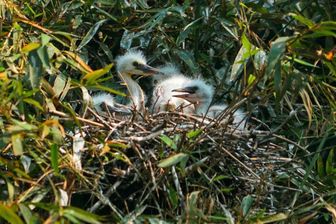让人惊喜的是,今年首批鸟宝宝已经成功“破壳”。部分鸟巢里,刚刚孵化出来的雏鸟睁着好奇的大眼睛,从枝叶间探出头,张开小嘴,等待哺食。