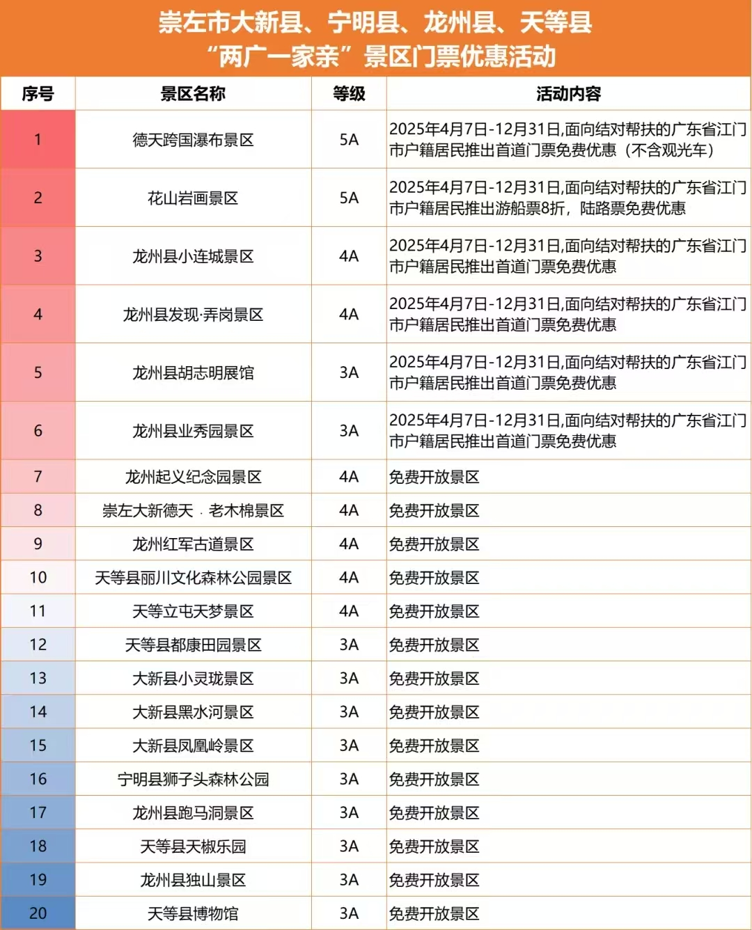 粤桂情谊深,近年来,广东以真金白银、真情实意的帮扶,助力广西绘就发展新画卷。其中,广东江门市帮扶广西崇左市大新县、宁明县、龙州县、天等县助力景区升级,引入先进管理与项目资金,助力乡村振兴,协同共辟精品旅游线路,两地全面合作发展新篇章,两广一家亲,感恩路同行。