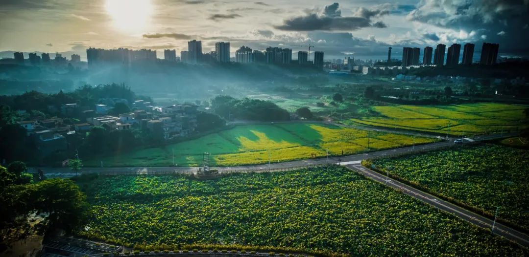 在台山台城街道桂水村,晨雾漫过楼房缝隙,淌向田野。作者:陈荣赞