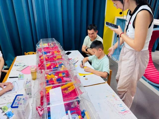 绘本讲读环节结束后,便进入了充满创意的绘画环节。本次绘画主题为 “校车和书包”,工作人员早已为亲子家庭准备好彩笔、卡纸等绘画材料。孩子们迫不及待地拿起画笔,在家长的陪伴和指导下,开始尽情发挥自己的想象力。