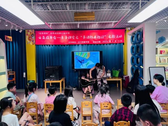 活动现场还巧妙穿插了尤克里里和吉他两种乐器。志愿者老师邀请小朋友们上台亲身体验,孩子们小心翼翼地触摸乐器,感受它们大小和重量的不同:尤克里里小巧轻便,孩子们单手就能轻松拿起;吉他则相对大一些、重一些,需要双手才能稳稳抱住。