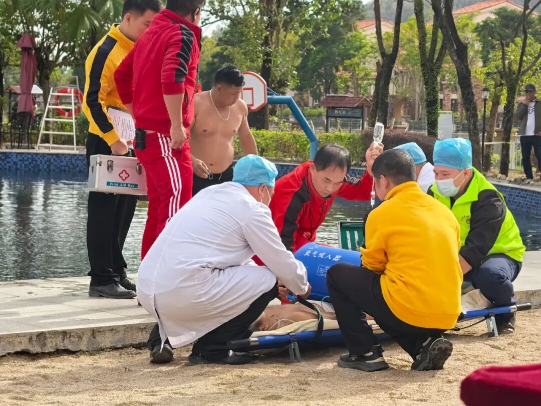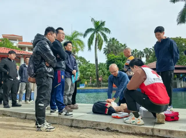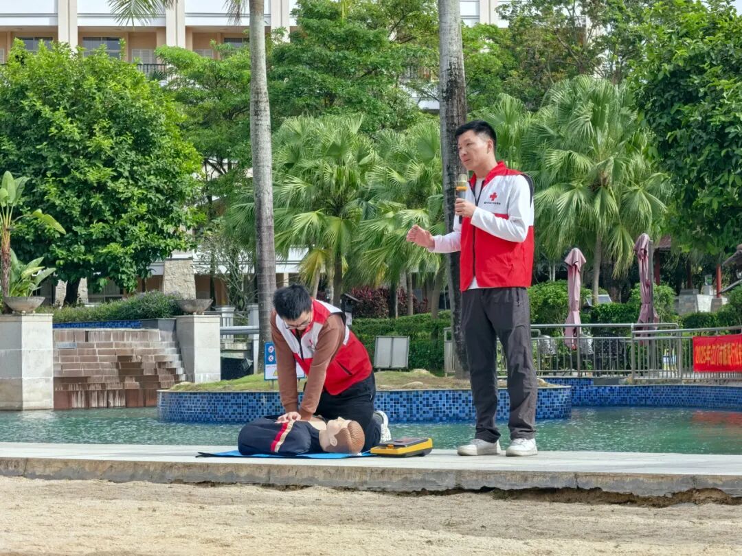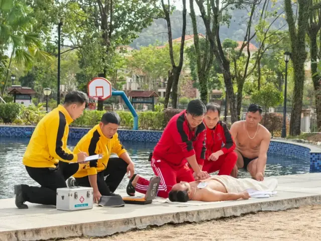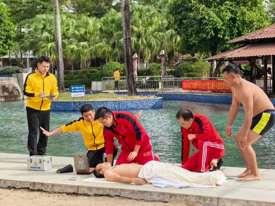 在下午实操培训和应急演练环节中,市文化广电旅游体育局紧密结合旅游行业实际特点,邀请恩平市红十字会对参会代表开展心肺复苏、AED体外除颤器的实操培训活动,并组织恩平山泉湾温泉酒店员工开展温泉池区突发疾病应急处置演练项目,让参会代表“沉浸式”体验,进一步加强了行业安全防范意识和应急处置能力。