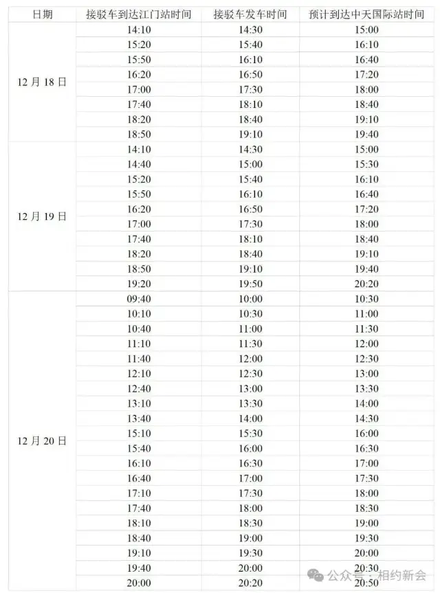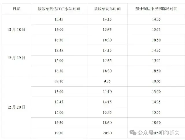 为方便外地跑友快捷顺利的到达五邑华侨广场领取参赛物资,组委会在2025年12月18日-12月20日特设置江门东站、江门站免费接驳车。选手到达江门站或江门东站后,可根据志愿者及指示牌的指引,凭参赛短信或报名成功页面截图上车。
