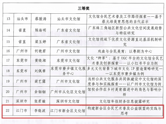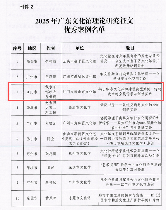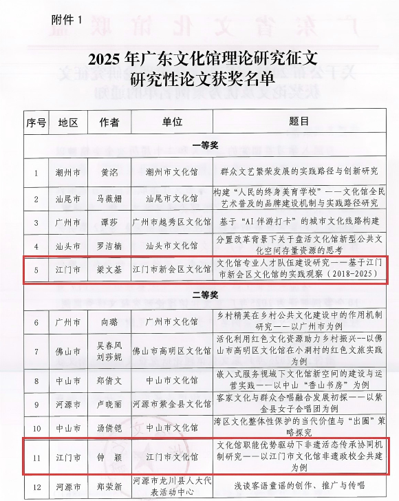 近日,2025年广东文化馆理论研究征文获奖名单正式公布,共有22篇研究论文分别获得2025年广东文化馆理论研究征文研究性论文一、二、三等奖;10个案例被评为2025年广东文化馆理论研究征文优秀案例。在此次省级权威评选中,江门市凭借扎实的理论探索与鲜活的实践总结,脱颖而出,共斩获3项研究性论文奖、1项优秀案例奖,成果丰硕,彰显了江门群文理论研究的深厚底蕴与创新活力。