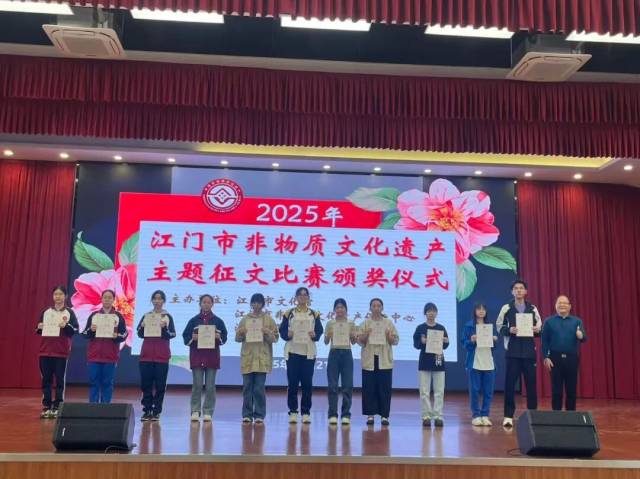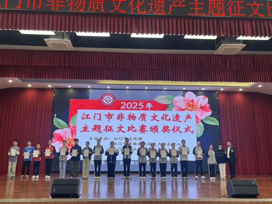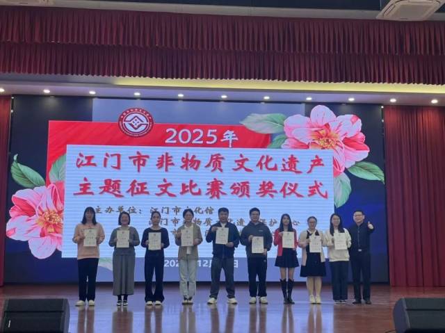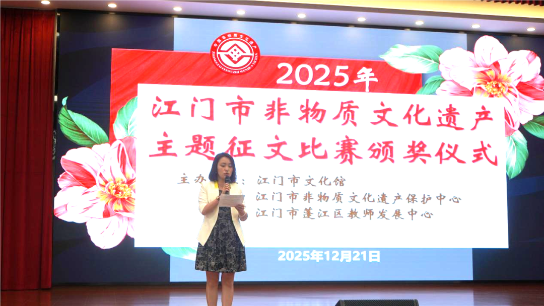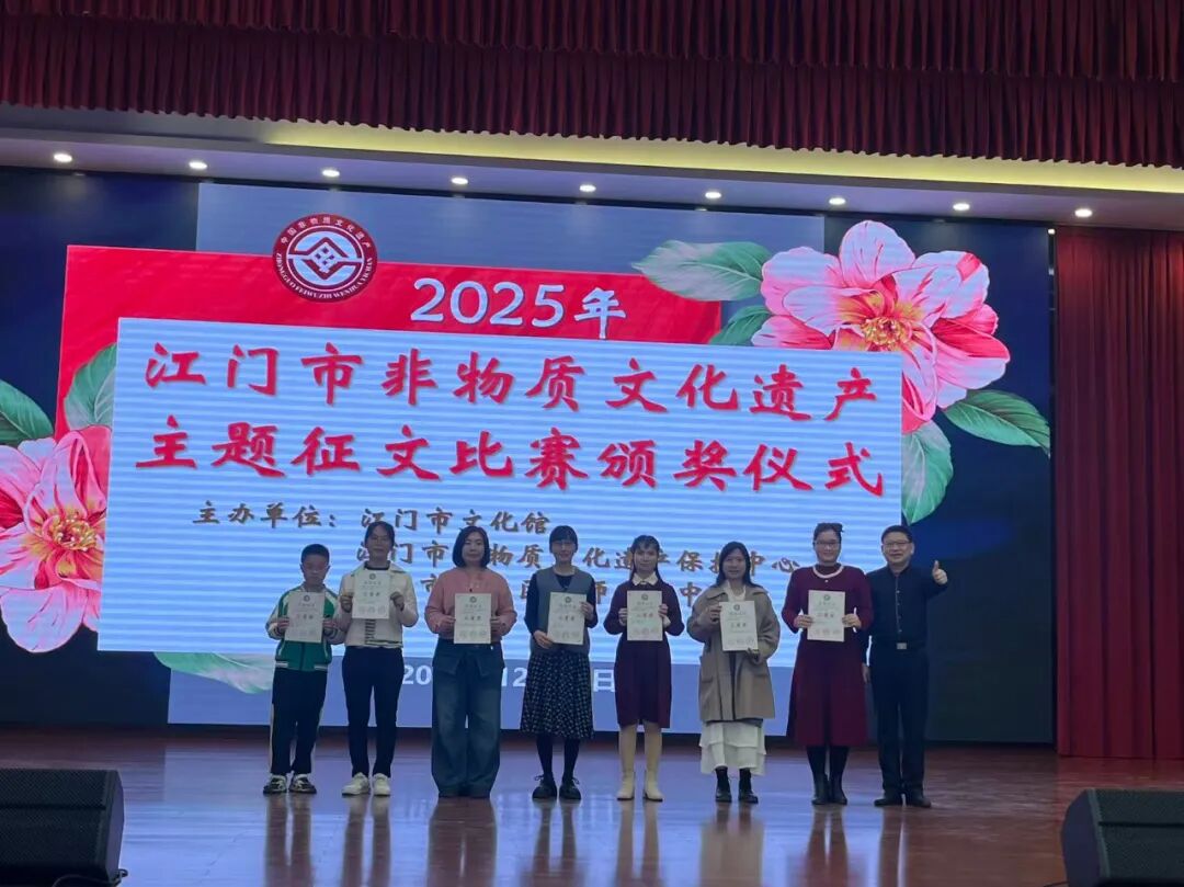2025年12月21日上午,由江门市文化馆、江门市非物质文化遗产保护中心、江门市蓬江区教师发展中心共同主办的“2025年江门市非物质文化遗产主题征文比赛”颁奖仪式在江门市蓬江区陈垣中学隆重举行。本次活动旨在弘扬侨乡非遗,让非遗深入民心、深入校园,让广大市民和在校师生了解江门侨乡的非遗魅力。