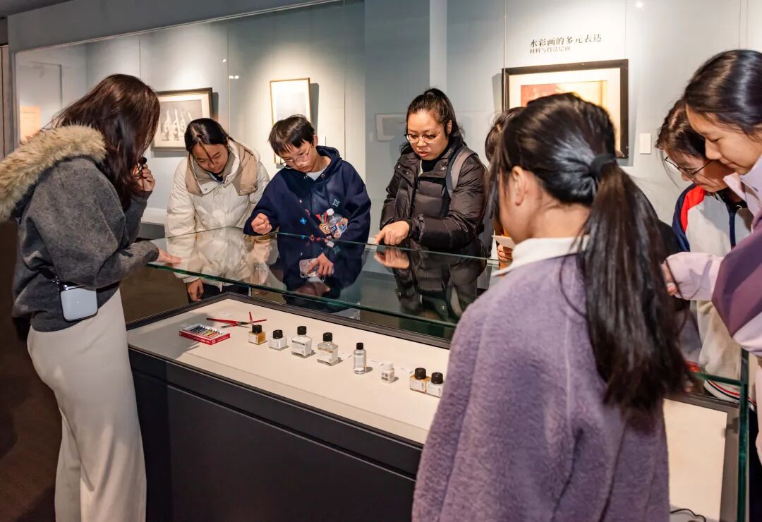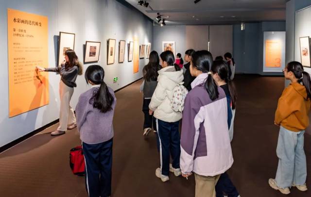 学员们首先在策展人的导览下参观展览,循着 “序篇+三大篇章”的脉络,逐一探寻水彩画 “西学东渐” 的传入路径与本土化实践、迭代蜕变与多元化表达的创新成果以及侨乡叙事的文化价值。