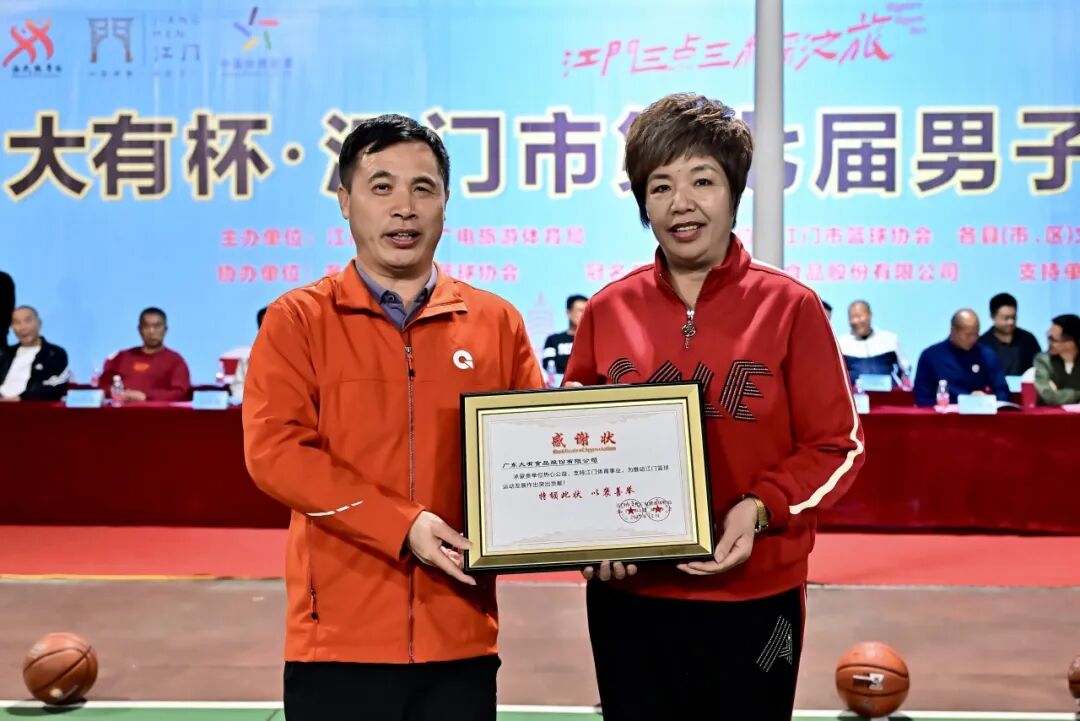 江门市文化广电旅游体育局副局长 柳超球向本届联赛冠名单位:大有食品股份有限公司颁发感谢状