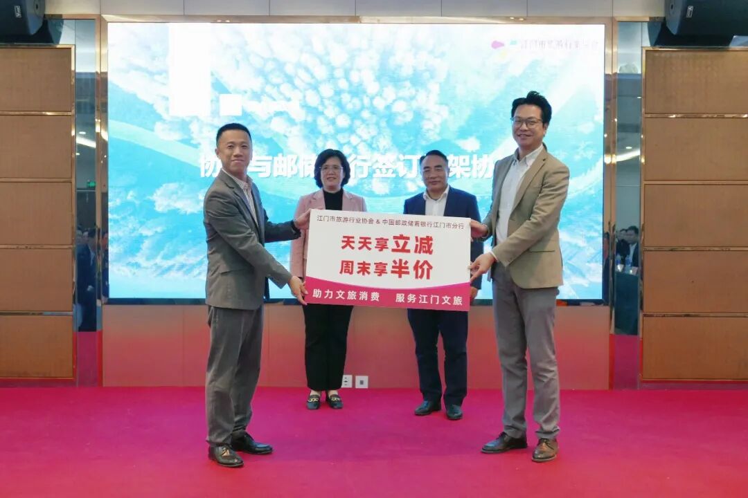 本次理事会议还专门邀请了中国邮政储蓄银行江门市分行相关业务负责人,向与会代表宣讲文旅行业贷款融资优惠政策和促消费补贴政策。此外,为贯彻落实党中央、国务院关于乡村振兴战略的决策部署及广东省“百千万工程”工作的要求,充分发挥金融资源对经济高质量发展的支撑作用,江门市旅游行业协会与中国邮政储蓄银行江门市分行本着“优势互补、资源共享、互利共赢”的原则,达成战略合作并签订框架协议。按协议内容,中国邮政储蓄银行江门市分行向江门市旅游行业协会授信10亿元。