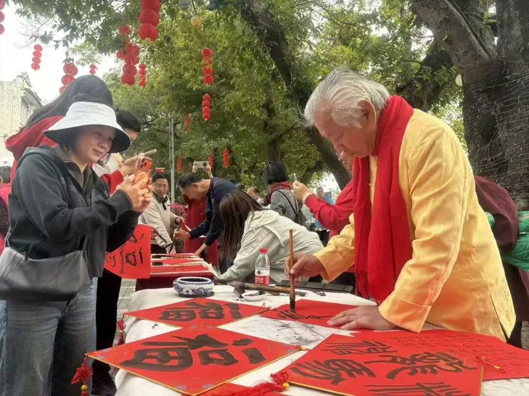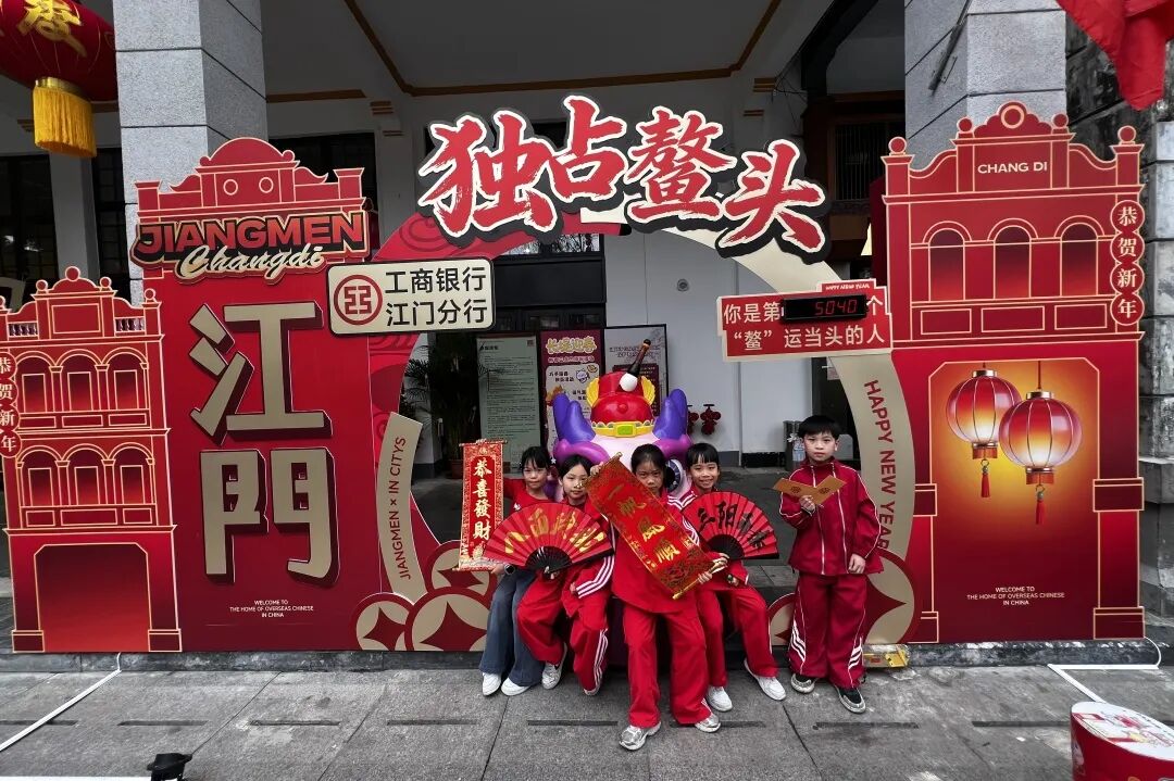 此外,在长堤分馆,博物馆巧妙结合社会热点,在馆门口特别打造了全运会同款大型鳌鱼艺术装置。该装置龙头鱼身、紫气东来,在百年骑楼的映衬下,传统与潮流碰撞出极具冲击力的视觉效果,迅速成为春节期间江门最热门的打卡点之一。大年初三,伴随龙狮巡游活动的热闹步伐,参加过博物馆冬令营培训的红领巾讲解员“集结”博物馆,与博物馆共同开展写福字活动,还为观众提供展览讲解服务,为市民游客送上了别具意义的新春祝福。