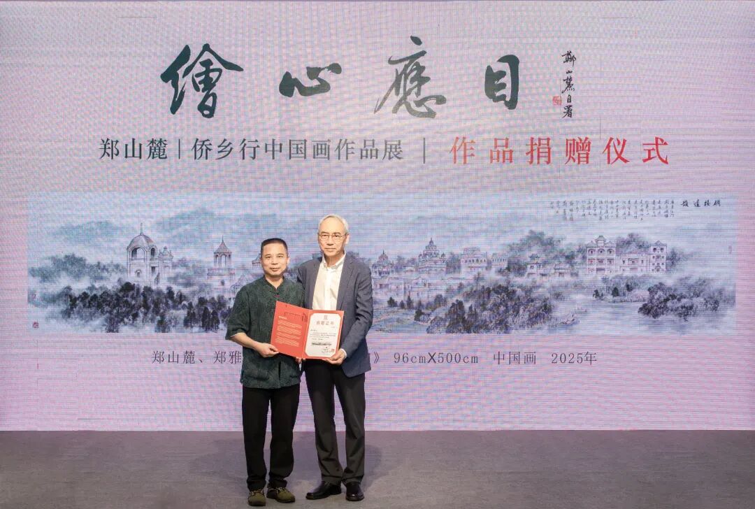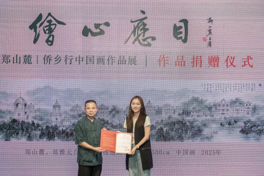 本次展览活动得到江门市政协书画院的大力支持,为了表达对支持单位的由衷感谢和真诚祝福,郑先生特地创作了国画作品《小鸟天堂》,无偿捐赠给江门市政协书画院。周文秘书长为郑山麓先生颁发收藏证书,并回赠《江门五邑籍书画名家作品集》给郑山麓先生并合影留念。