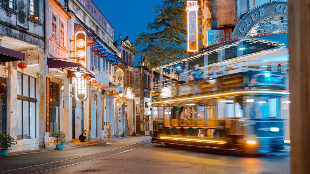 中西合璧的骑楼群亮起灯火,氛围感拉满,“金墟”从书中走出,傲然立于眼前。建筑在光影的变换中更显细节,像加上了一层滤镜,整个古镇蒙上浪漫光辉。乘上二层复古铛铛车,璀璨霓虹,港味十足。