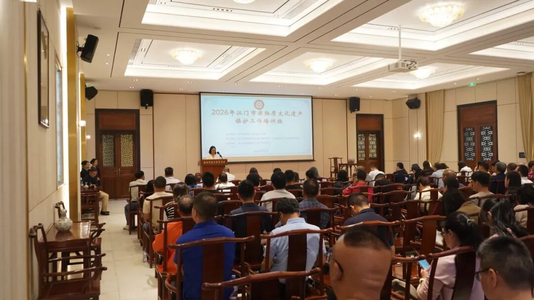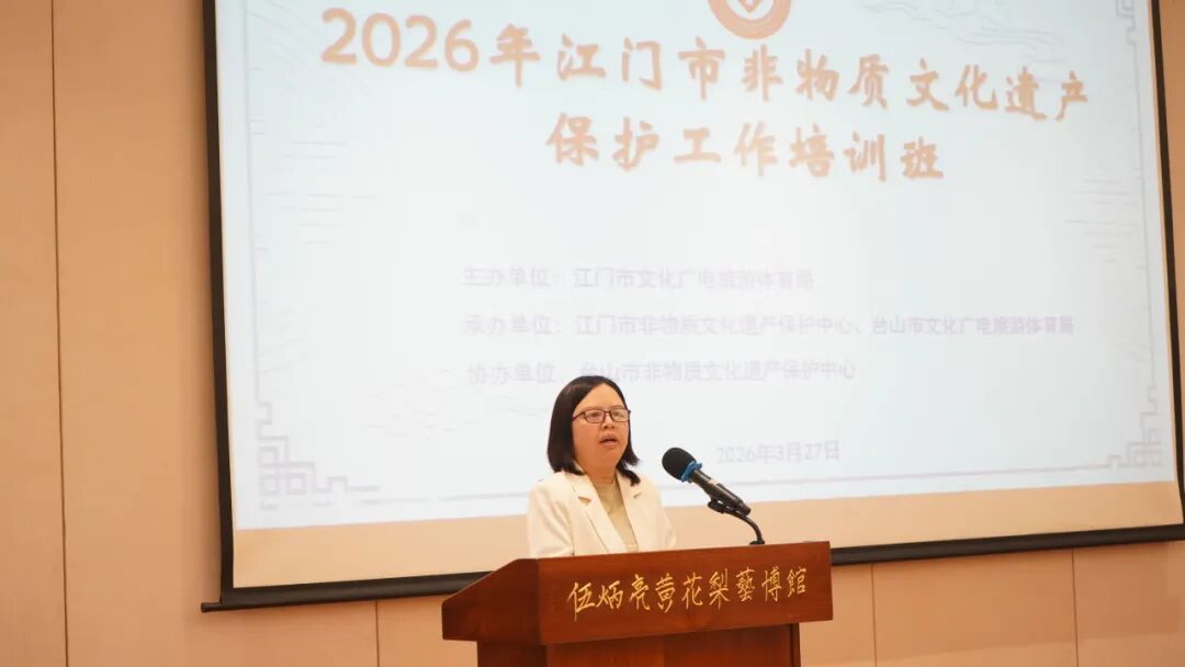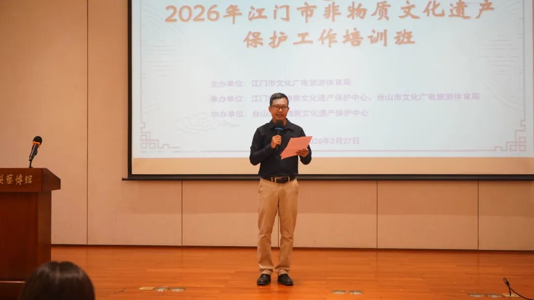 春满侨乡,非遗同行。3月27日,由江门市文化广电旅游体育局主办,台山市文化广电旅游体育局、江门市非物质文化遗产保护中心承办,台山市文化馆协办的2026年江门市非物质文化遗产保护工作培训班在台山市顺利举行。来自全市各县(市、区)文广旅体局分管领导、文化馆馆长及分管副馆长、非遗从业人员、代表性传承人和项目保护单位负责人等齐聚侨乡,以“专题授课+实地研学”的形式,共探江门非遗保护传承新路径。