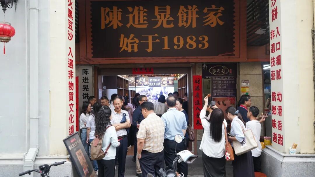 随后,学员们走进台山非物质文化遗产展厅开展实地研学,通过实物、图文与技艺演示,全方位了解台山特色非遗项目的传承脉络与保护成果,沉浸式感受侨乡非遗的深厚底蕴。学员们还走访周边街区品尝台山豆沙月饼等非遗美食,走进台山优品超市参观特色产品运营模式,近距离感受非遗与日常消费、市场发展的融合实践,为后续探索“非遗+”融合发展路径积累鲜活经验。