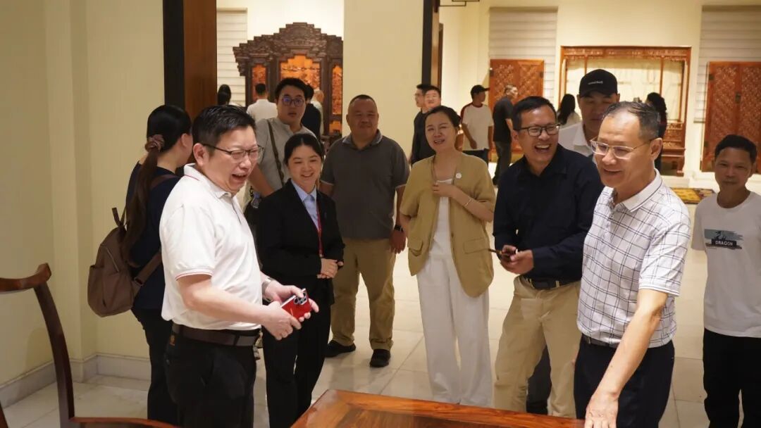 下午,学员们走进伍炳亮黄花梨艺博馆开展实地研学。在馆藏珍品、工艺讲解与匠艺解读中,深入了解黄花梨家具的制作技艺、传承脉络与保护成果,沉浸式感受中式古典家具的匠心美学与侨乡非遗的深厚底蕴。学员们近距离观摩黄花梨木温润细腻的纹理、严丝合缝的榫卯结构与精湛雕工,学习伍炳亮大师 “守正创新” 的非遗传承理念,直观体会传统木作技艺与当代文化传播、市场发展的融合实践,为非遗活化传承汲取宝贵经验。