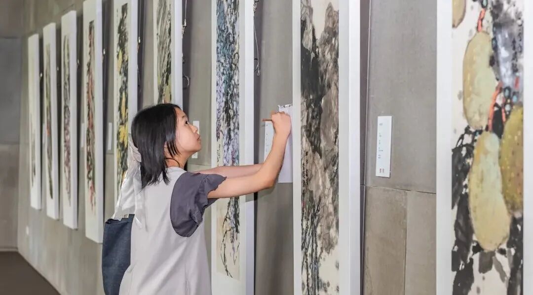 讲解环节,讲解员带领学员们依次走过“时代追忆”“生活印记”“自然咏叹”三大篇章。在“时代追忆”中,学员们透过李醒韬先生一幅幅宣传画,感受色彩的运用如何传递不同人物的气质与时代精神;在“生活印记”里,水彩与油画作品的丰富光影、厚重笔触,让孩子们体会到如何用明暗对比与质感刻画记录生活的温度;步入“自然咏叹”,讲解员重点剖析了先生晚年开创的“红果墨叶”风格——将西画的光影理念融入传统水墨,以浓淡干湿的墨色写叶,以鲜亮饱满的重彩点染果实,学员们踊跃讨论体积感与层次对比,课堂气氛热烈。