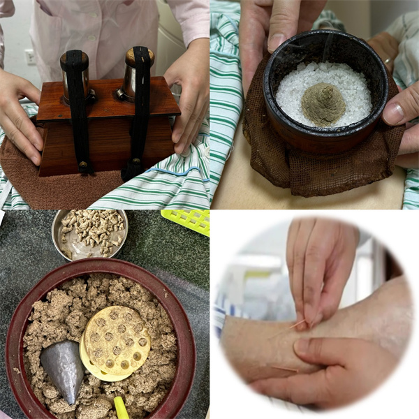图:上1:无烟艾箱灸,上2:脐灸,下1:麦粒灸,下2:踝腕针