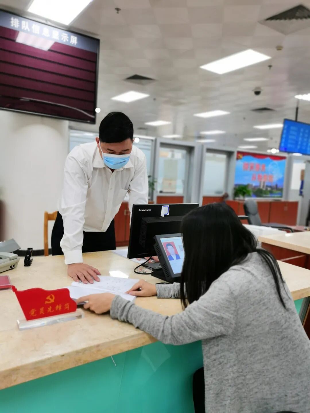 一是亮出身份。窗口支部所有党员在工作时间统一佩戴党员徽章,窗口放置党员先锋岗牌,插旗亮牌,用先锋岗、模范岗带动群众岗,把履职践诺放到明处,落到实处。