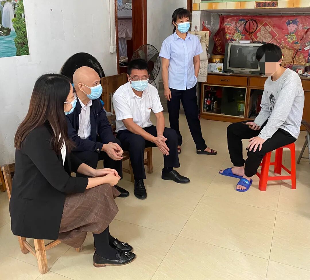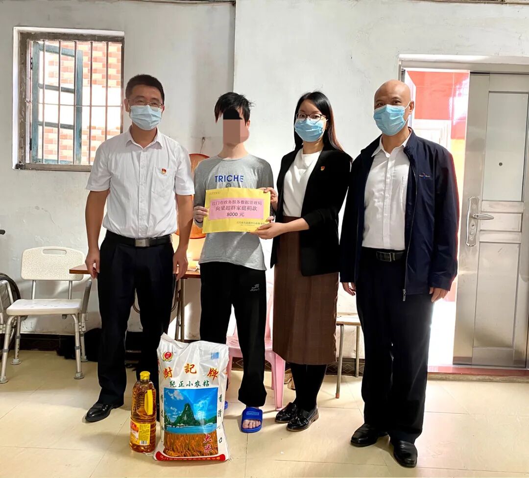 2020年10月23日上午,金秋送爽,万里无云。江门市政务服务数据管理局行政服务中心党支部受局党组委托,一行五人来到结对帮扶镇—开平市马冈镇,探望慰问官堂村贫困户梁超群家庭,并送上局全体干部职工为其家庭所捐款项8000元和米油慰问品。