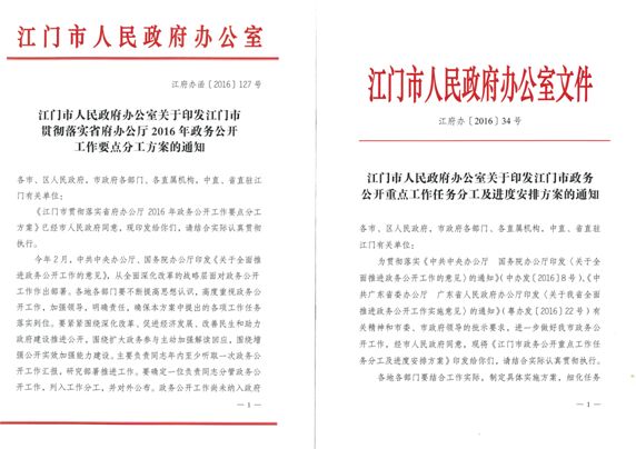 1.全面推进重点工作任务落实。认真贯彻落实党中央、国务院和省委、省政府的决策部署,结合我市实际,制定并印发《江门市政务公开重点工作任务分工及进度安排方案》,对2020年前我市政务公开提出了37项重点工作任务;根据上级的要求,结合我市发展需要,紧紧围绕深化改革、促进经济发展、改善民生和助力政府建设推进公开,制定下发《2016年政务公开工作要点分工方案》,明确96项工作任务和具体要求,压实牵头落实单位责任。全年抓好重点工作任务和工作要点的落实,积极做好跟踪工作,定期检查进展情况,对进展不理想的工作任务进行督查督办,确保工作任务按期完成或按计划推进。