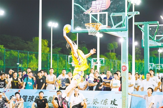 江门日报讯 (文/图 皇智尧 张浩洋) 这个假期,江门迎来了一场充满青春气息的体育赛事。6月23日,由市文广旅体局主办、市篮球协会承办,各县(市、区)文广旅体局、各县(市、区)篮球协会协办的“2023高考学子‘狂飙’江门三人篮球争霸赛暨三分王扣篮王擂台赛”在元宝山体育公园开幕。