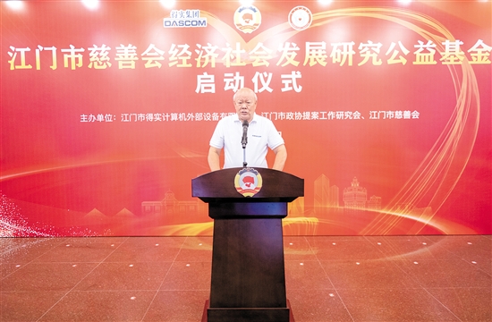 5月8日,我市成立首只用于支持开展服务经济社会发展调查研究的公益基金,江门市得实计算机外部设备有限公司首期捐赠100万元。图为该公司董事长张可治在启动仪式上发言。