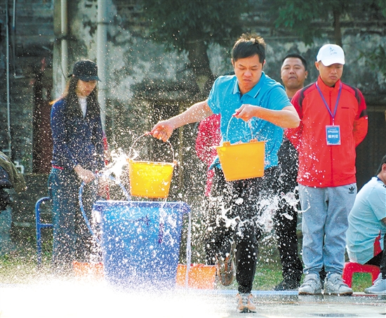 男子抗旱保苗比赛最激烈,选手提着水桶向前冲,既要快,还要稳。