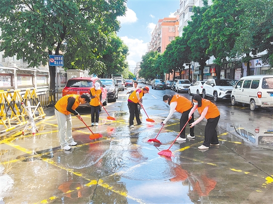 广东江门中医药职业学院大学生志愿者合力清扫街道积水。