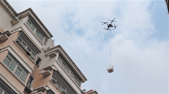 应急救援无人机将楼顶打包好的垃圾安全吊运至地面,极大提升了清运效率。