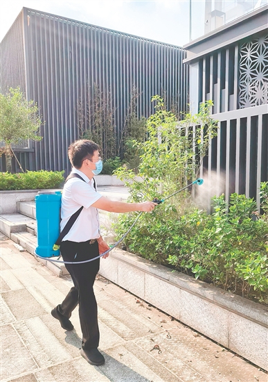健威广场工作人员对商场周边环境进行消杀,减少蚊虫孳生。
