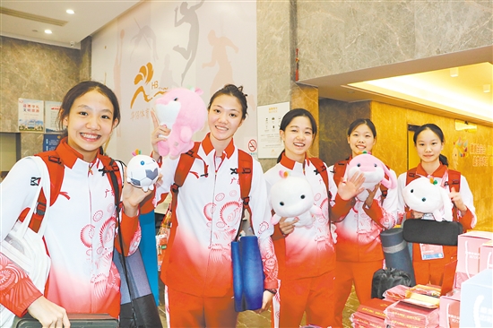 昨日,来自全国各地的花样游泳运动员陆续抵达江门赛区。酒店内的吉祥物玩偶深受运动员喜爱。