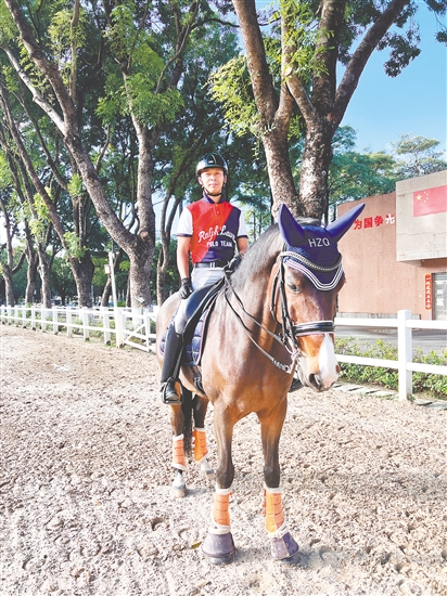 马术比赛十分考验骑手的技术和其与坐骑的默契。马术盛装舞步个人预赛的赛场上,黄焯钦与他的“伙伴”卡斯坦默契十足,伴着舒缓悠扬的旋律,用优雅、敏捷的动作赢得了个人预赛第二名的好成绩。