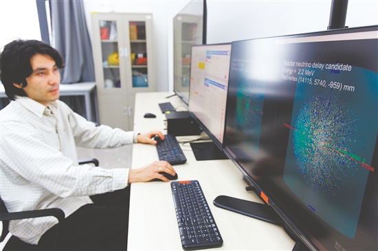 11月19日,科研人员在江门中微子实验运行控制室监测探测器运行情况。新华社发