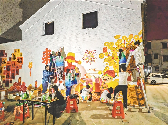蓬江区环市街道里村社区党群服务中心联动多方绘制墙绘,为社区增添春节氛围。