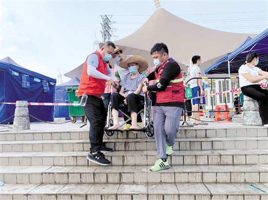 沙坪街道越塘村党员干部在核酸检测点搀扶老人。 受访者供图