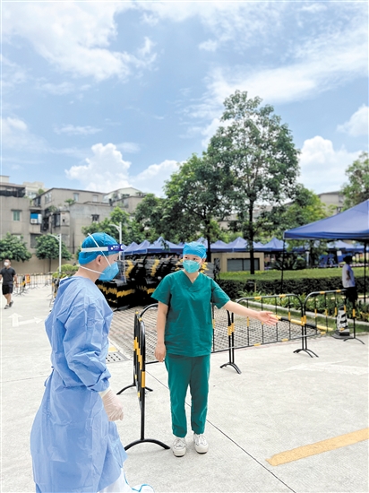 “鹤山、新会一家亲,从来都是你中有我、我中有你。”9月4日晚,刚结束深圳防疫支援任务的鹤山市人民医院主管护师麦奕敏还来不及返回鹤山,便又率队直接赶赴新会区,参与新的疫情防控任务。“接到驰援新会的任务后,队员们都义无反顾,干劲十足,没有一人退缩、抱怨,全身心投入核酸采样工作。”麦奕敏说。