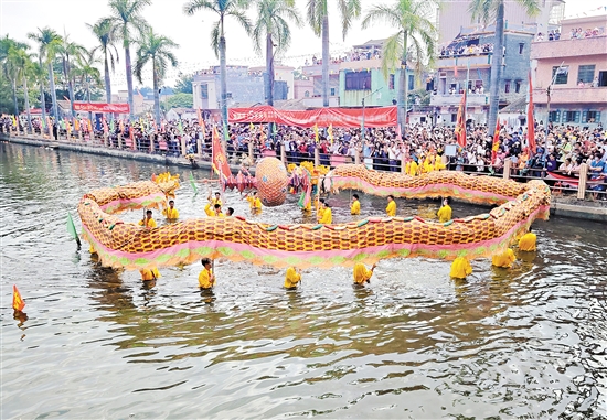 金龙村的接灯方式尤为特殊,巨型花灯需穿水而过,场面很是壮观。