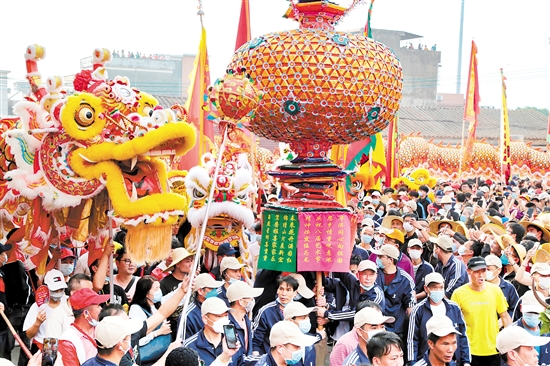 花灯、金龙、醒狮、人群……泮村灯会现场热闹喜庆。