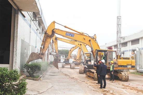 “两手抓、两不误、两促进、两必胜!”昨日(3月3日),在荷塘镇西堤一路旧工业区内,红色的宣传标语激发无限动力——深圳科技园江门园区正式动工建设,4台挖掘机一字排开,轰隆作响,现场一片繁忙景象。未来,这里将成为江门承接深圳产业转移的重要平台。