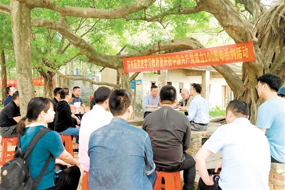 在群星公园知青农场的大榕树下,老党员陆国明为环市街党员干部上党史教育课。 环市街供图