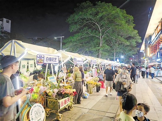 “晚上我约了朋友,饭后散步,聊聊天,买点小饰品。现场来逛集市的人真不少。”4月30日晚9时许,市民陈小姐与她的闺蜜用餐完毕后,步行到中天新地商圈外的集市。“刚在附近吃完饭,就想出来走一走消消食,也呼吸一下新鲜空气。我们有一段时间没见了,一见面,大家话题聊都聊不完。”她笑着说。