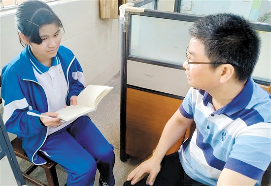 来自睦洲中学的谢杏清采访了党员教师区振图。她在记录本上写道:“春蚕到死丝方尽,蜡炬成灰泪始干。”据了解,区振图除了关心学生的学习情况,还主动关心学生的生活情况,经常在课间休息时与学生谈心,分享他的求学经历。