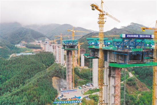 记者在现场看到,一座座高高耸立、整齐排列的墩身在山川之间拔地而起,几个主墩全部完成封顶,正在进行上部结构施工。随后,记者在袁武的带领下,搭乘施工电梯上到了22号墩的施工平台。这里采用全封闭操作平台施工,作业人员在平台内行走和作业便捷安全。