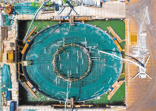 俯瞰黄茅海大桥中塔承台浇筑施工现场。