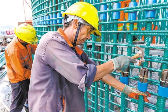 施工人员顶着烈日绑扎钢筋。