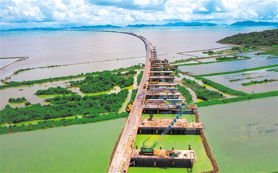 黄茅海大桥西引桥墩身施工正在进行中。