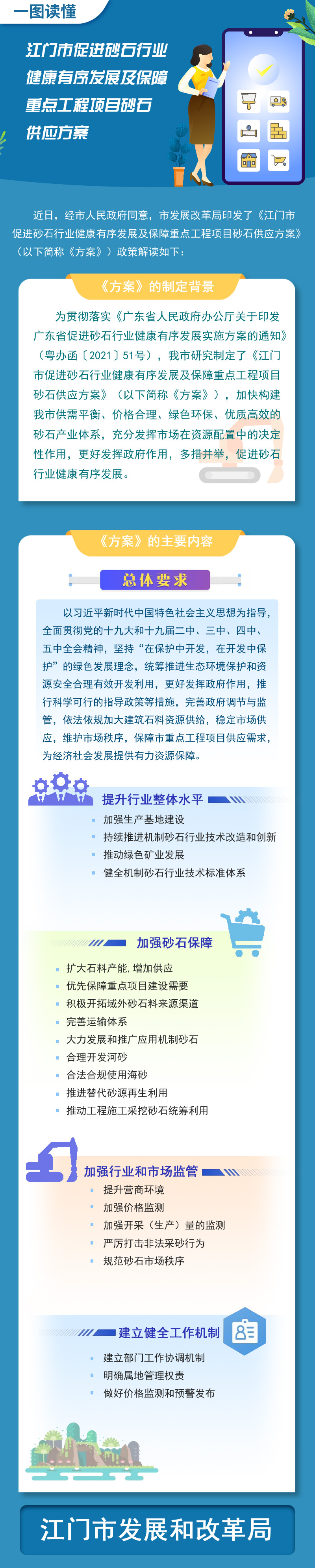 根据市政府在《广东省人民政府办公厅关于印发广东省促进砂石行业健康有序发展实施方案的通知》(粤办函〔2021〕51号)的批示精神, 为进一步促进砂石行业健康有序发展,经市人民政府同意,现将《江门市促进砂石行业健康有序发展及保障重点工程项目砂石供应方案》印发给你们,请遵照执行。实施中遇到的问题,请径直向市发展改革局反映。