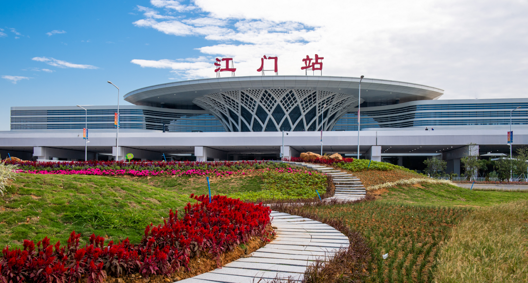 珠西综合交通枢纽江门站位于江门市新会区,站房规模超4万平方米,连同站房配套工程总建筑面积达23万平方米,建设8站台20线,总投资约40亿元。江门站是粤港澳大湾区西翼铁路综合交通枢纽,将汇集深茂铁路等7条轨道交通,并预留了城市轨道交通线接入条件,是省内仅次于广州南站、深圳北站、佛山西站的第四大轨道交通枢纽。